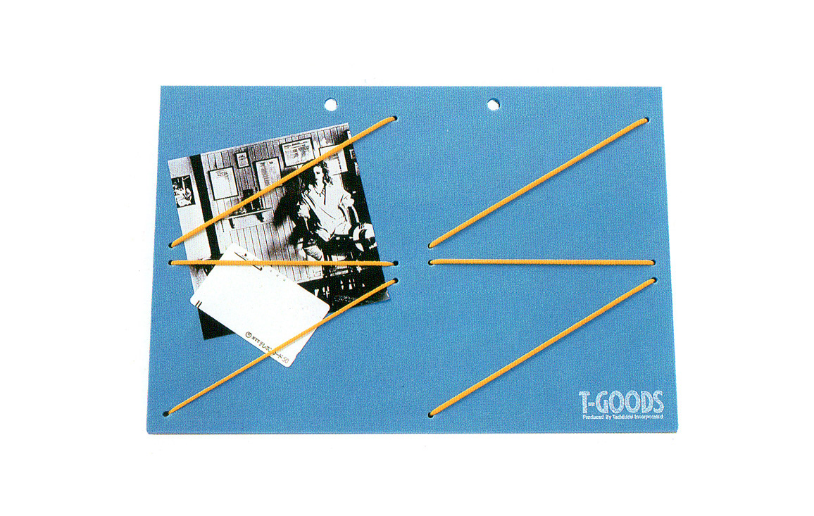 クッション性のある発泡ウレタンボードにゴムを使った便利なピンナップボード。ペンや定規も挟め壁を傷つけないので安心。安価な材料でも、デザイン次第で生活を豊かにできる製品になる。